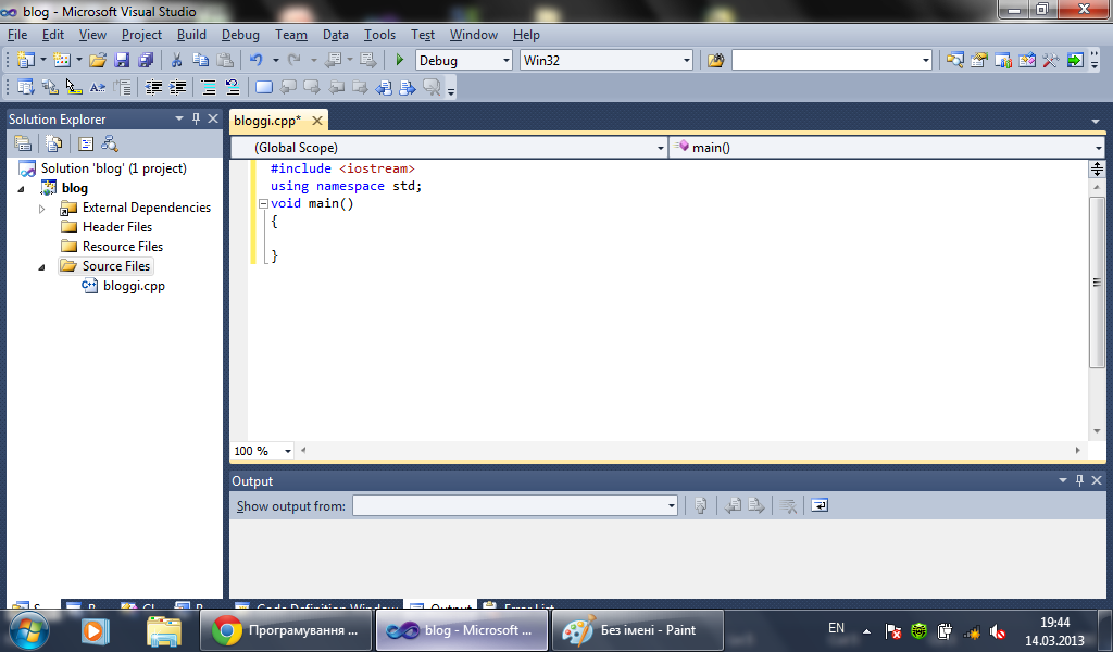 Зліва на розкладці Solution Explorer (якщо його нема то можна настроїти у верхній розкладці View), виділяємо Source Files правою кнопкою мишки --> Add --> New Item