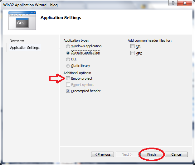 Потім натискаємо Visual C++. Вибираємо Win32 Console Application (червоне коло), даємо назву вашому проекту (жовта риска), і потім з'явиться кнопка OK (коричневе коло) і тиснемо на неї.
