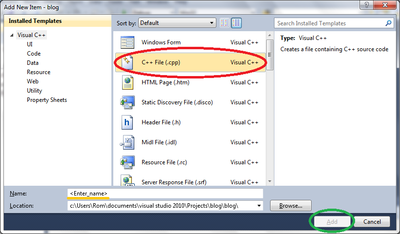 Вибираємо C++ File (.cpp) , даємо назву (потрібно щоб назва аркуша не співпадала з назвою проекту), і тиснемо Add. Вигляд іконки буде такий: